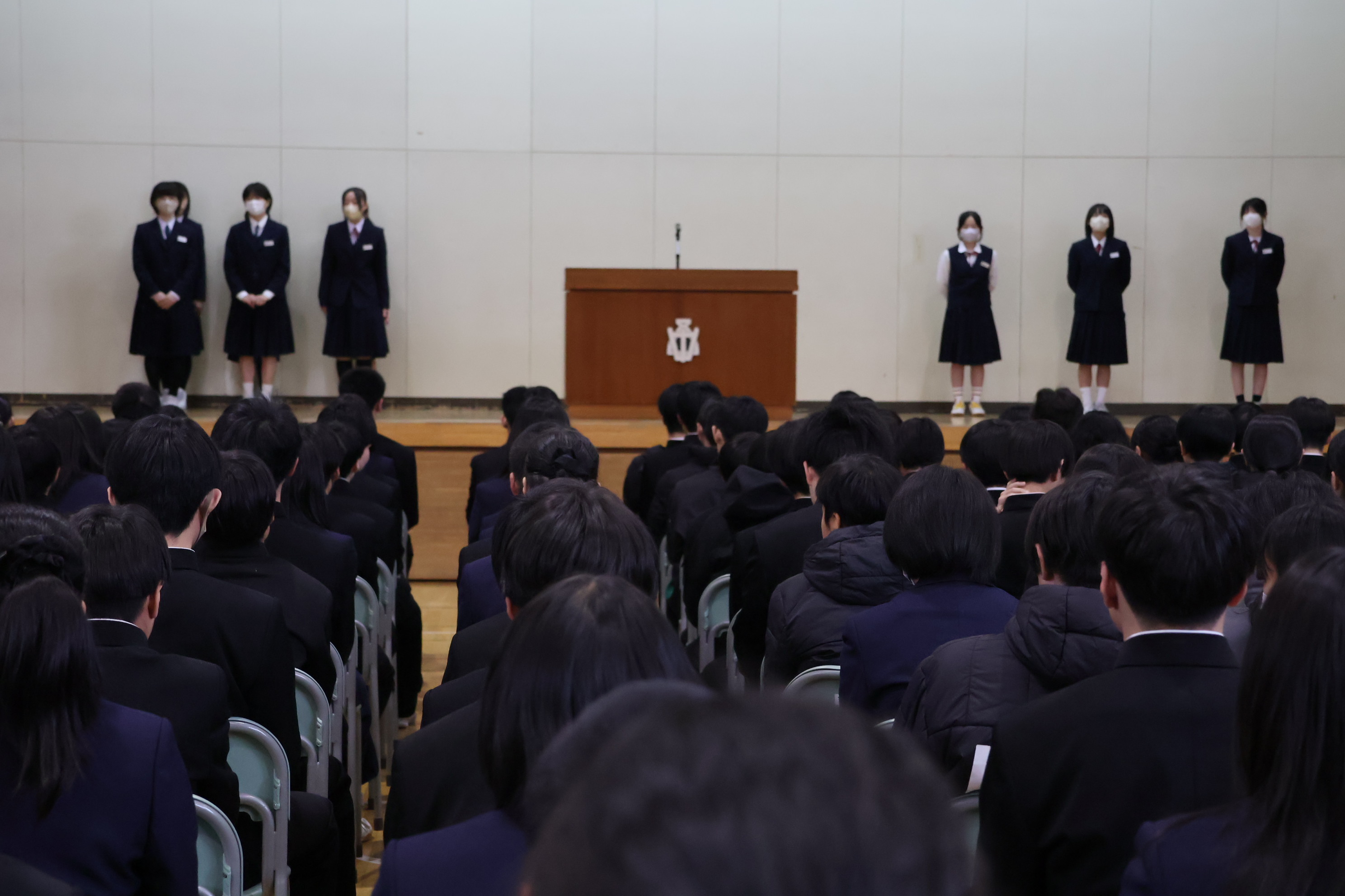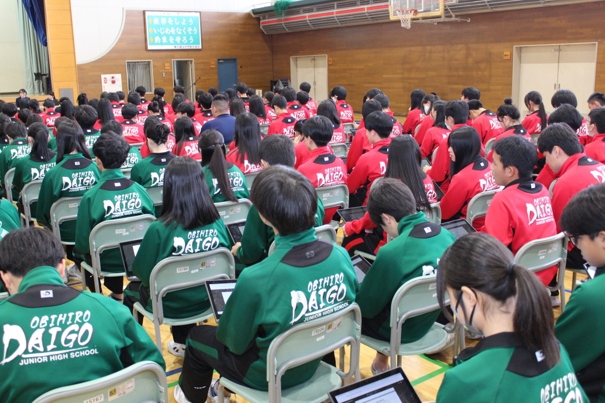 ・校長は学級目標に触れ、個人や学級ですべきことについて話をしました。また、冬休み中に全道大会に出場する女子バスケット部とスピードスケートの選手の壮行会も行いました。